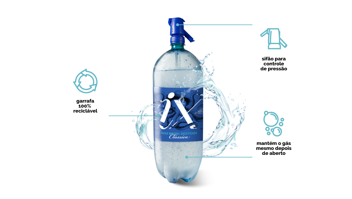 A Água com Gás iX oferece uma experiência refrescante e prática para bares e restaurantes. Com um design inovador de garrafa com sifão, ela mantém a pressão e o frescor mesmo após aberta, garantindo uma bebida sempre borbulhante. Disponível em duas versões — Clássica e Levíssima (com menos sódio) — iX é perfeita para servir pura ou como base para drinks e coquetéis.